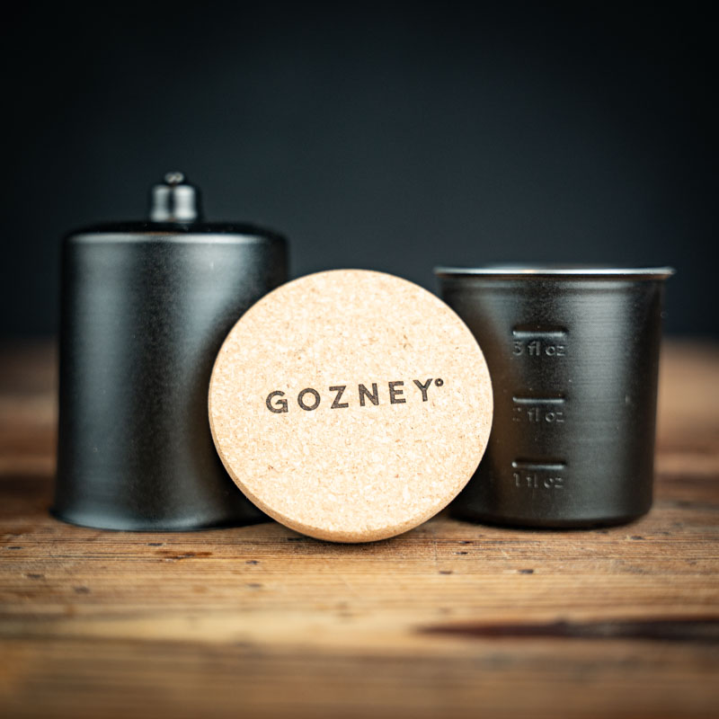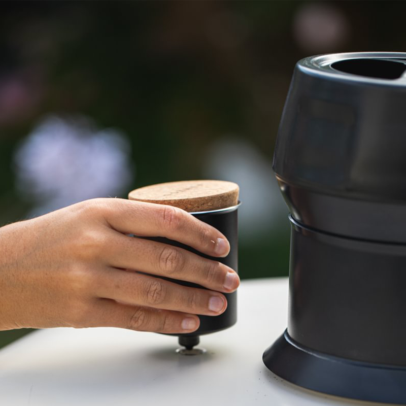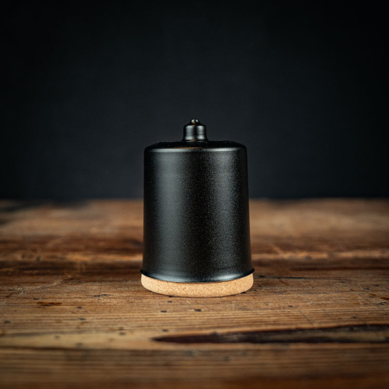 Een zwart geanodiseerde aluminium trechter met een kurken top, precies ontworpen om de juiste hoeveelheid water in de oven te spuiten en stoom te creëren bij het binnentreden.