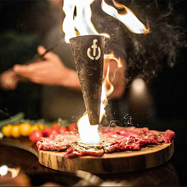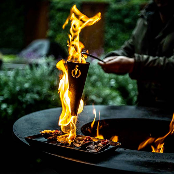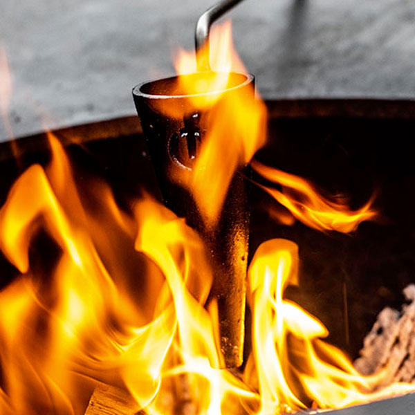 De Olive Forged Flambadou is een gietijzeren kegel die ontworpen is om verhit te worden totdat deze roodgloeiend is. Hij kan dus direct in het voor of kolen geplaatst worden. Wanneer de Flambadou heet is kan er vet in geplaatst worden. Hierna vat het vlam en smelt het vet uit de onderste opening van de kegel. Dit brandende vet kan dan op een stuk vlees, vis (of net wat je wilt) gesprenkeld worden waardoor je het gerecht extra smaak geeft. De flambadou heeft een grote opening aan de bovenkant en een kleine opening aan de onderkant en is bevestigd aan een lang handvat van hoogwaardig staal met een olijfhouten heft.
