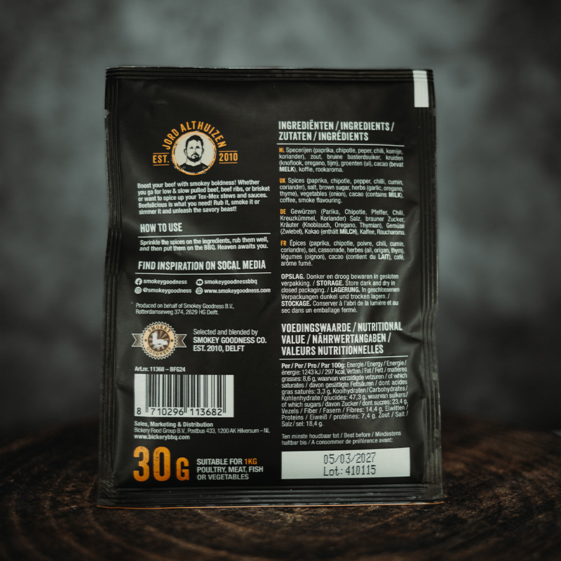 Wrijf rundvlees voor bereiding in met een royale hoeveelheid Smokey Goodness Beefalicious BBQ rub, nu in een kleine test verpakking. Ook leuk om te geven! Grill de lekkerste steaks of ga voor de ultieme low & slow klassiekers als pulled beef, beef ribs of brisket. Gegarandeerd succes, that is our promise!
