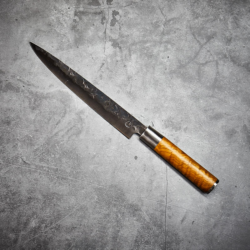 De inspiratie van de VG10 lijn komt uit Japan. Dit is te zien in de overgang van de lemmet naar het heft. De hardheid van 60 Rockwell wordt door het Japanse VG10 staal verzorgd. De messen zijn in 5 lagen gesmeed, deze techniek zorgt ervoor dat snijcomfort en scherpheid is verzekerd. Het handvat is gemaakt van wortelhout en wordt geleverd met een bruine lederen hoes.